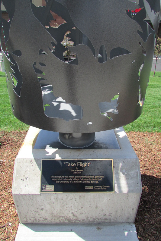 Just a few months before I accepted this position, the installation of my public sculpture, funded by a scholarship at UCCS, took place. The sculpture is now on view at the University Village Center on Nevada and Garden of the Gods behind Bonefish Grill. As a conceptual artist, my work is driven by the meaning behind the design. “Take Flight” features a swirl of birds who begin surefooted on the ground and steadily take flight in a continuous flow of energy. As Communications Coordinator, I believe this is my chance to Take Flight in my career and in life!
